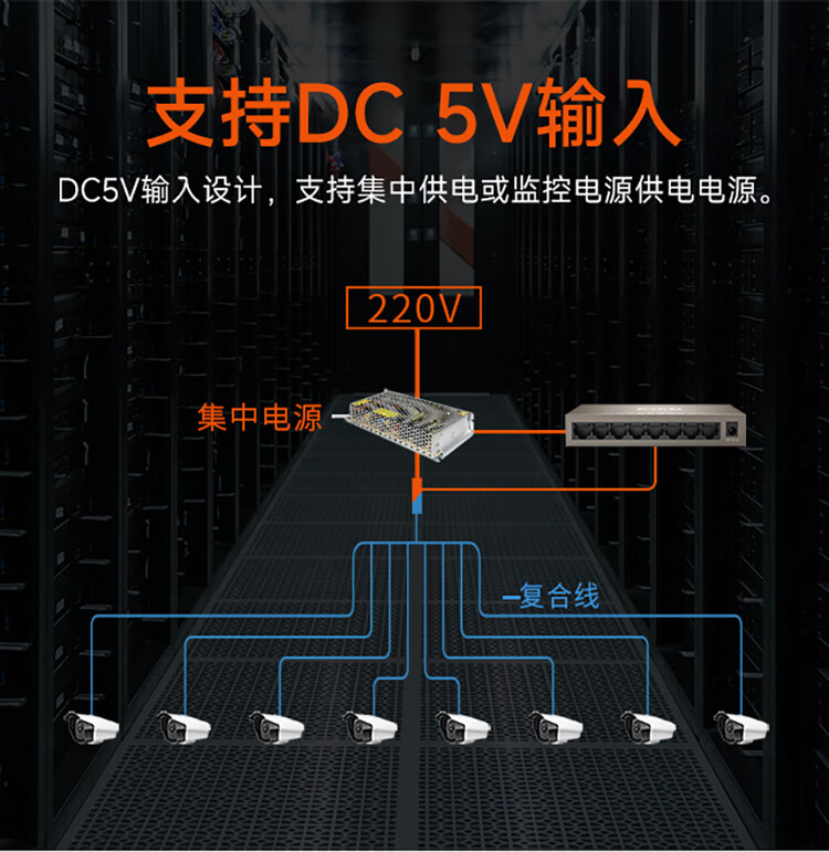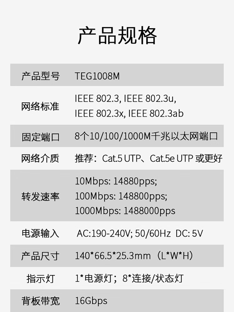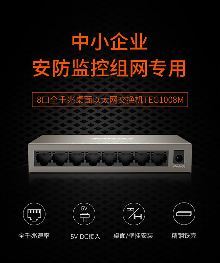 腾达(Tenda)TEG1008M 8口千兆交换机 钢壳壁挂式 安防网络监控摄像头专用分线器 分流器